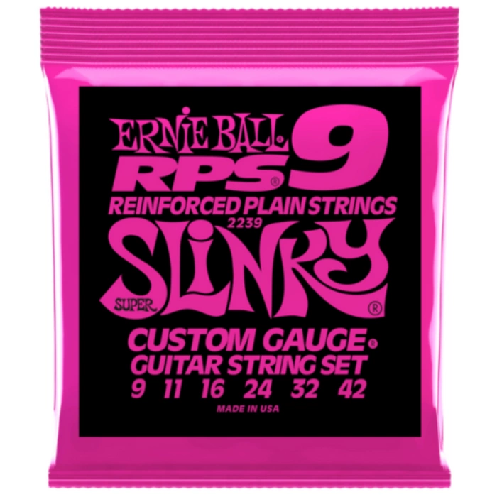- Ernie Ball 2239 Super Slinky RPS Nickel Wound to struny do gitary elektrycznej, które charakteryzują się wyjątkową trwałością i stabilnością strojenia dzięki niklowanemu drutowi stalowemu owiniętemu wokół ocynowanego sześciokątnego rdzenia.