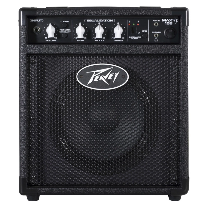 - Peavey MAX 158 – combo basowe 20W z głośnikiem 8”, EQ 3-pasmowym, tunerem, TransTube boost, AUX i wyjściem słuchawkowym. Idealny do ćwiczeń i prób.