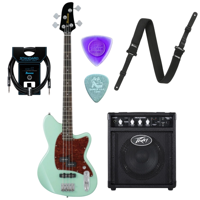 Zestaw basowy Ibanez TMB100-MGR + Peavey MAX 158 to kompletny pakiet dla początkujących i średnio zaawansowanych basistów, którzy chcą rozpocząć naukę gry lub rozwijać swoje umiejętności na sprzęcie renomowanych marek. W zestawie znajduje się gitara basowa Ibanez Talman TMB100-MGR, wzmacniacz Peavey MAX 158 20W oraz wysokiej jakości akcesoria – pasek Ibanez GSF50-BK Powerpad, kabel Ibanez SI10 i dwie kostki Dunlop.